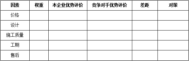 F、關(guān)鍵成交因素對比:對于某一個(gè)細(xì)分領(lǐng)域的客戶而言,成交的關(guān)鍵因素選項(xiàng)是相對清晰的,而這些因素對成交的影響權(quán)重是不同的,經(jīng)營分析就需要識(shí)別競爭對手在哪些關(guān)鍵成交因素上占據(jù)優(yōu)勢。例如:對于裝飾裝修工程行業(yè)的家庭客戶而言,其成交因素包括:價(jià)格、設(shè)計(jì)、施工質(zhì)量、工期、售后的維修維保服務(wù)等。對于一個(gè)收入中等的自住新房客戶而言,價(jià)格、設(shè)計(jì)因素、施工質(zhì)量是其主要成交因素,而對于商鋪、投資房產(chǎn)來說,工期的重要性不言而喻。如下表: